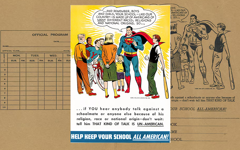 As if to serve as a reminder, an early 1950s illustrated poster (above) occasionally resurfaces on social media. In it, Superman stands before a group of kids and delivers a firm yet friendly lesson about respecting diversity. It looks like your standard bit of wholesome Americana — truth, justice, civics class vibes, and such, but its online efficacy shows how everything old is new again, including bigotry and xenophobia. The image first appeared in 1949 as a brown paper school book cover distributed to classrooms across America by the Institute for American Democracy, and the art is believed to be by Superman legend Wayne Boring (though the words themselves remain uncredited).